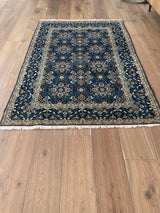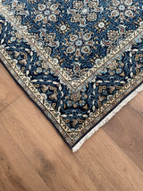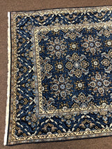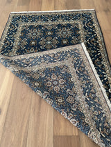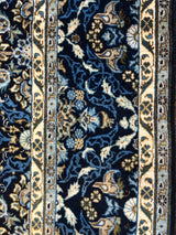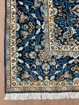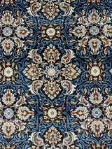 This particular rug features an elegant all-over floral pattern, intricately woven with remarkable attention to detail. Its serene blue, vegetable-dyed color is both calming and visually captivating, enhanced by a gentle sheen and a luxuriously soft texture. In very good condition, it retains a full pile throughout. The borders display slight curvature, and the fringes have thinned somewhat, but overall the rug remains in excellent shape. Clean and floor-ready, it is a timeless piece that will bring beauty and character to any space.