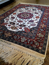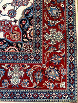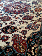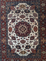 Among the finest handmade rugs ever made, Isfahan (Esfahan) rugs are the pinnacle of the Persian rug. In an enchanted city, renowned for its taste and finesse, these rugs are of great delicacy and utmost intricacy. The city of Isfahan holds pride of place in the Persian rug industry because of its rich history and reputation dating back to the 16th century. Most Isfahan rugs are finely detailed in wool and silk, often woven on a base of pure silk. Until the middle of the 20th century colours were mostly bold with red and blue motifs on the ubiquitous beige. Still, at the sight of curvilinear vines snaking over an elegant field around an exquisite medallion, the word 'Isfahan' tends to spring to one's mind. Patterns include pictorial and tree-of-life schemes, as well as the Shah Abbas field with its floral vines.