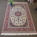Among the finest handmade rugs ever made, Isfahan (Esfahan) rugs are the pinnacle of the Persian rug. In an enchanted city, renowned for its taste and finesse, these rugs are of great delicacy and utmost intricacy. The city of Isfahan holds pride of place in the Persian rug industry because of its rich history and reputation dating back to the 16th century. Most Isfahan rugs are finely detailed in wool and silk, often woven on a base of pure silk. Until the middle of the 20th century colours were mostly bold with red and blue motifs on the ubiquitous beige. Still, at the sight of curvilinear vines snaking over an elegant field around an exquisite medallion, the word 'Isfahan' tends to spring to one's mind. Patterns include pictorial and tree-of-life schemes, as well as the Shah Abbas field with its floral vines.