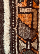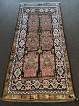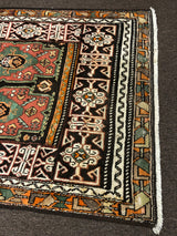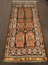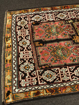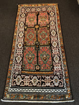 Kazak is a small city in northwest Azerbaijan.  The Caucasus is an area bounded by the Black and Caspian Sea to the east-west, Russia to the north, and Turkey and Persia to the south.  This rug is hand-knotted by Kazak skilled artisan weavers in the early 20th century.  It has six medallions.  The design inspiration for this rug originated from the entrance wooden door to a villager's dwelling.   This tribal antique rug is made of pure wool and is adorned with decorative elements of geometric field design and borders, making a great floor and hanging decoration.  It features rose salmon centre motifs on a brown background bordered by ivory, orange and green natural dyes.  Overall very good condition.  Even pile and natural wear throughout.  The bindings are original, and the fringes are complete and intact.  This decorative aesthetic rug appeals to both connoisseurs and interior designers.