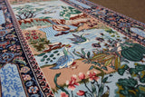 Each panel of the rug illustrates a distinct scene — spring blossoms, summer gardens, autumn leaves, and winter tranquillity — intricately rendered in fine silk and wool on a pure silk foundation.