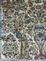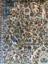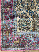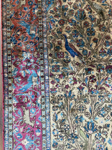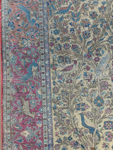 Its borders reflect classic Kashan design, featuring delicate rose hues adorned with birds and running animals, framed by twin guard bands that balance symmetry and movement. The harmonious interplay of ivory, blue, gold, and blush pink tones creates an atmosphere of peace and quiet grandeur.